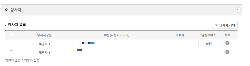 등록한 당사자 목록의 채권자, 채무자를 확인합니다.