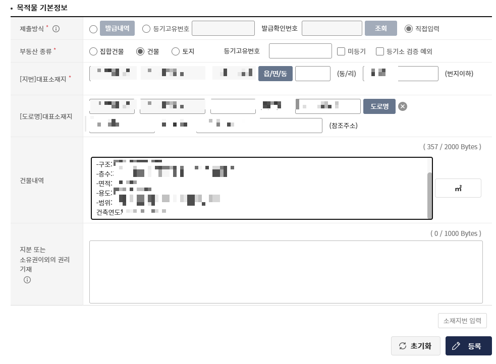 등기에 적힌 등기고유번호도 입력해야 합니다.