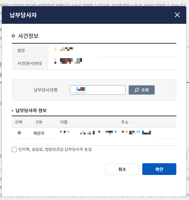 납부당사자인 채권자를 클릭하고