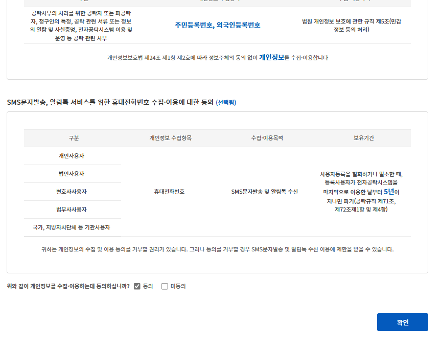 동의에 체크하시고 '확인'을 클릭합니다.