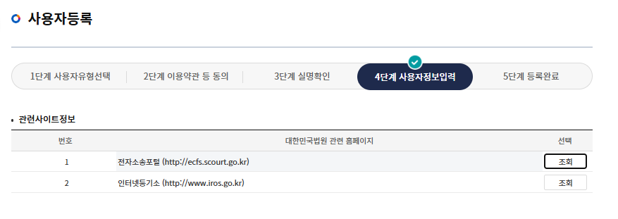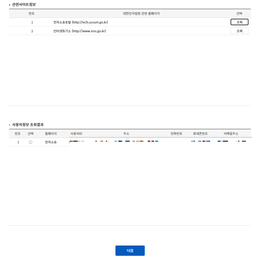 법원 관련 홈페이지에 가입했던 사용자 정보가 뜨고