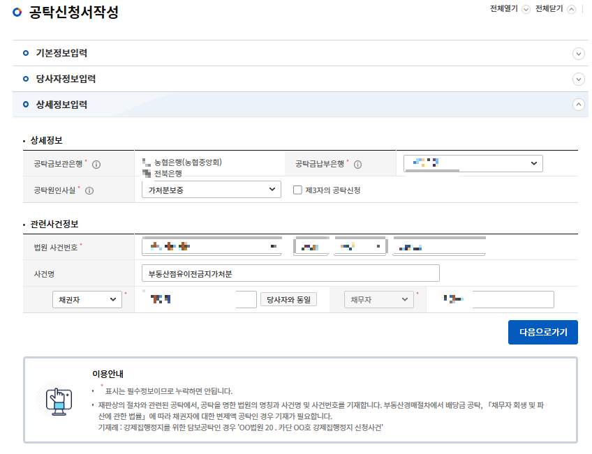 관할지역과 법원, 사건번호등을 입력하고,