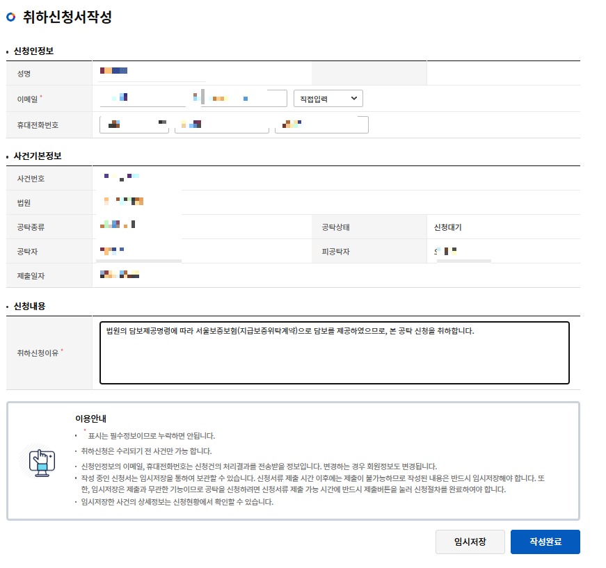 취하 신청 이유를 적어 '작성완료'를 클릭합니다.