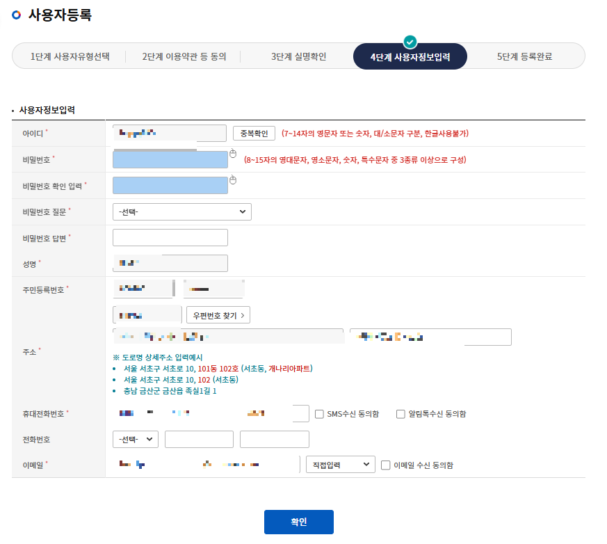 기본정보와 아이디, 비밀번호를 입력 후