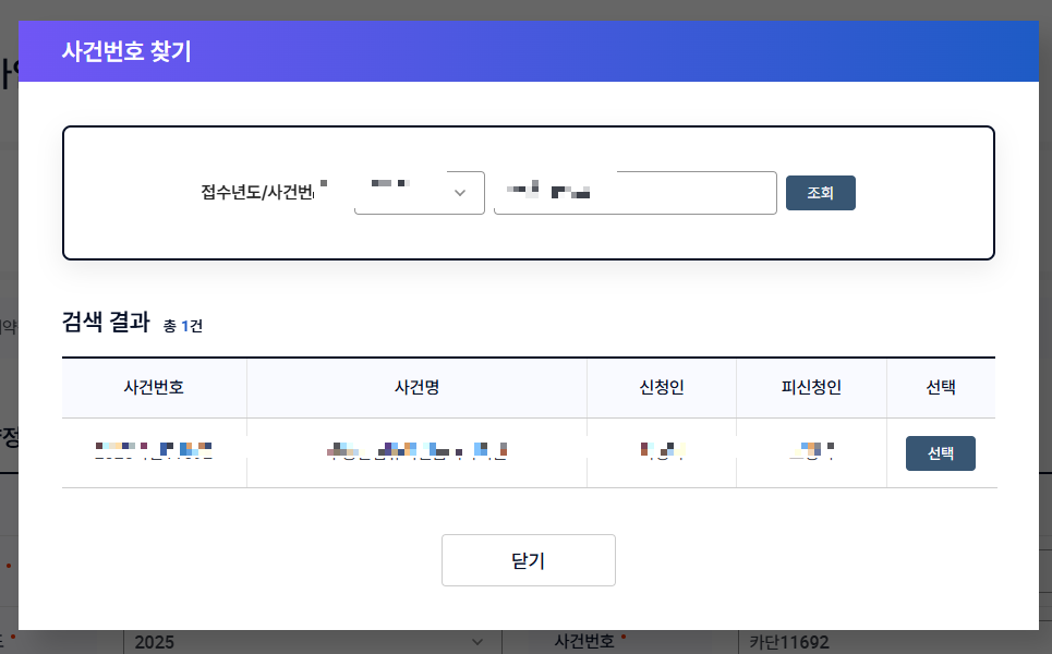 사건번호를 입력하여 검색하고 사건을 선택합니다.
