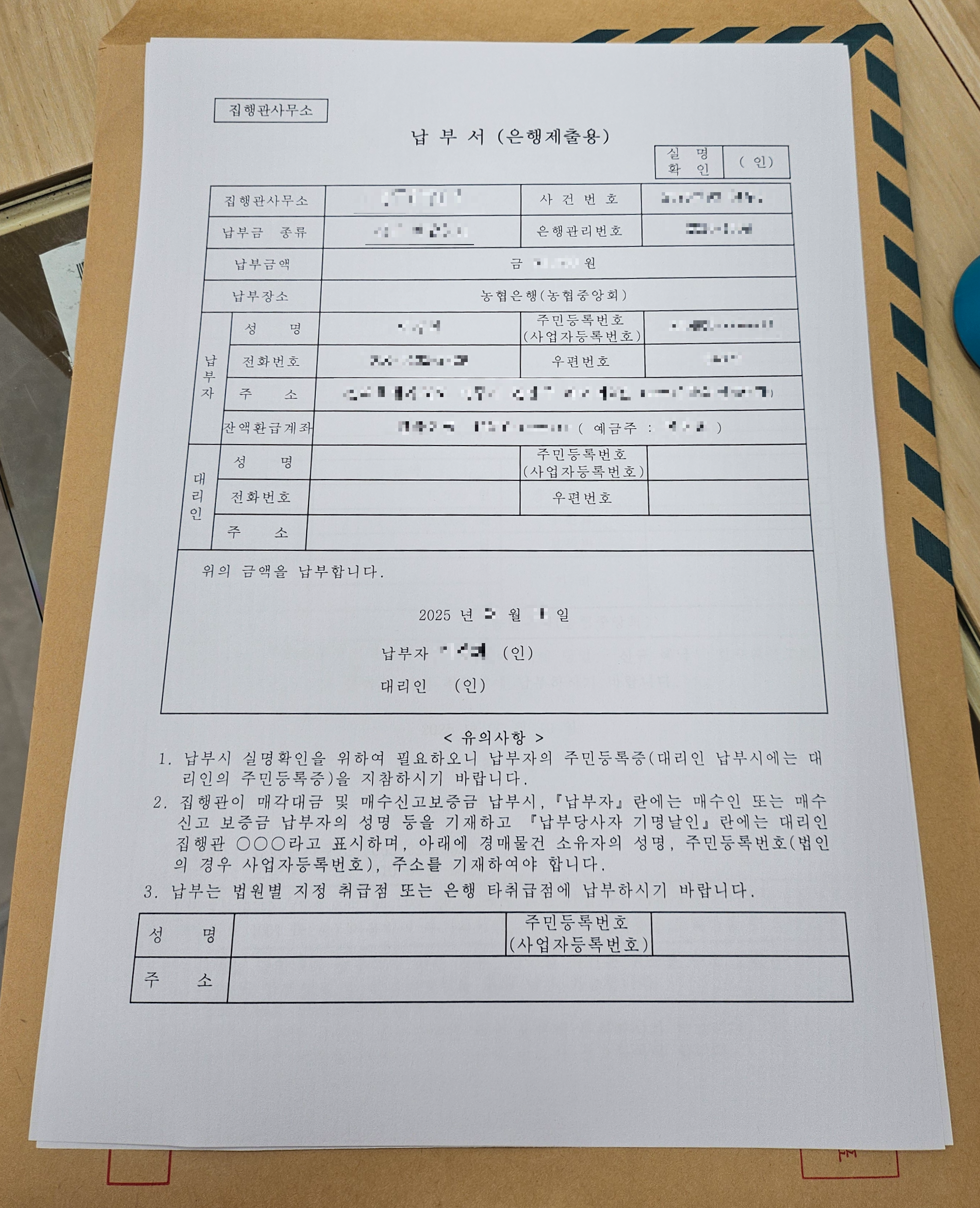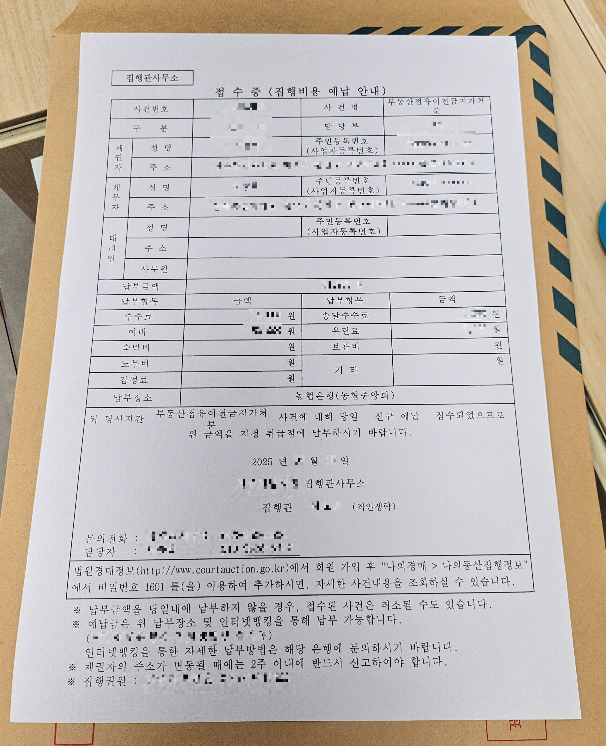 집행비용에 대한 예납안내서와 은행 제출용인 납부서를 받을 수 있습니다.