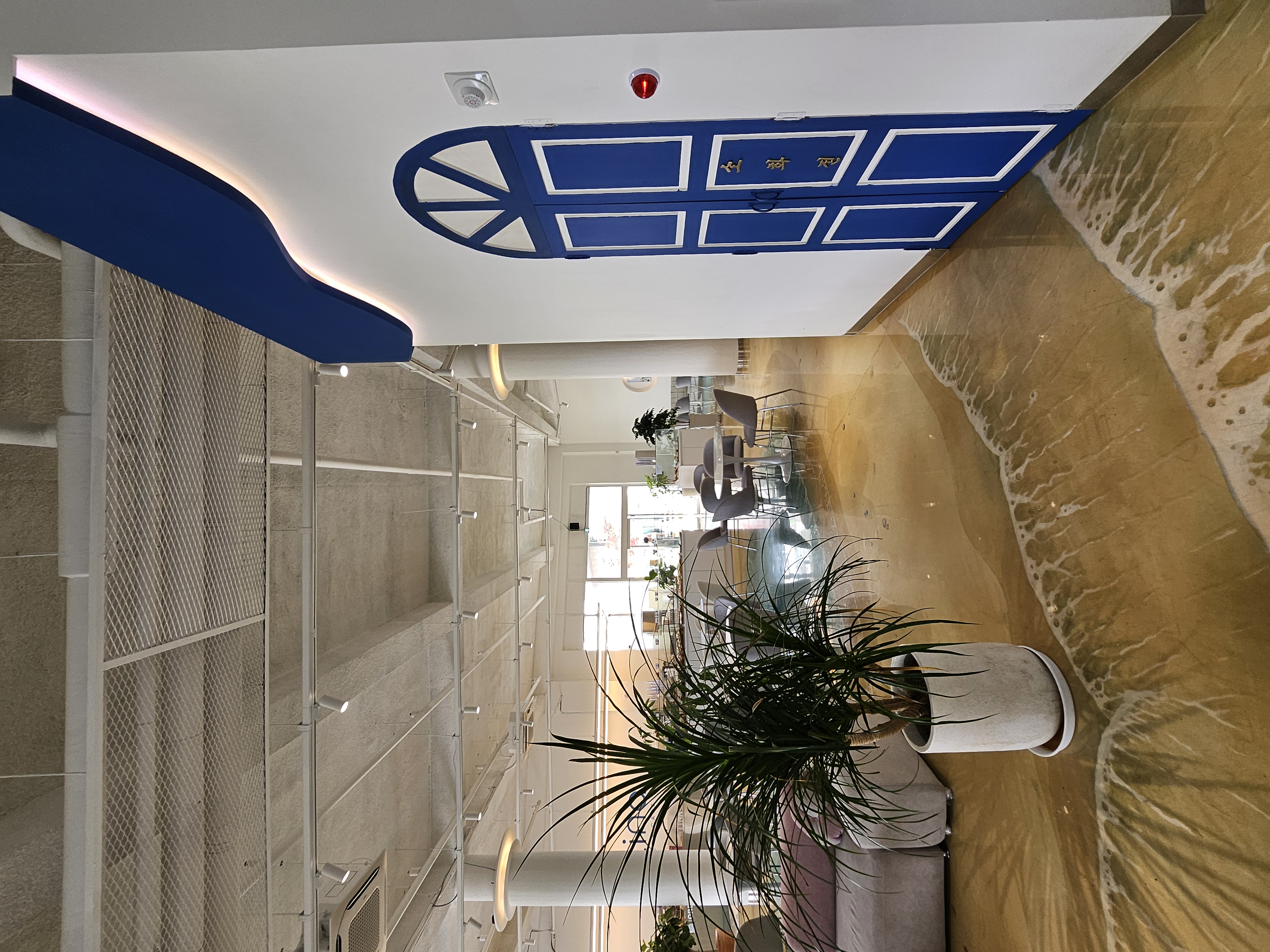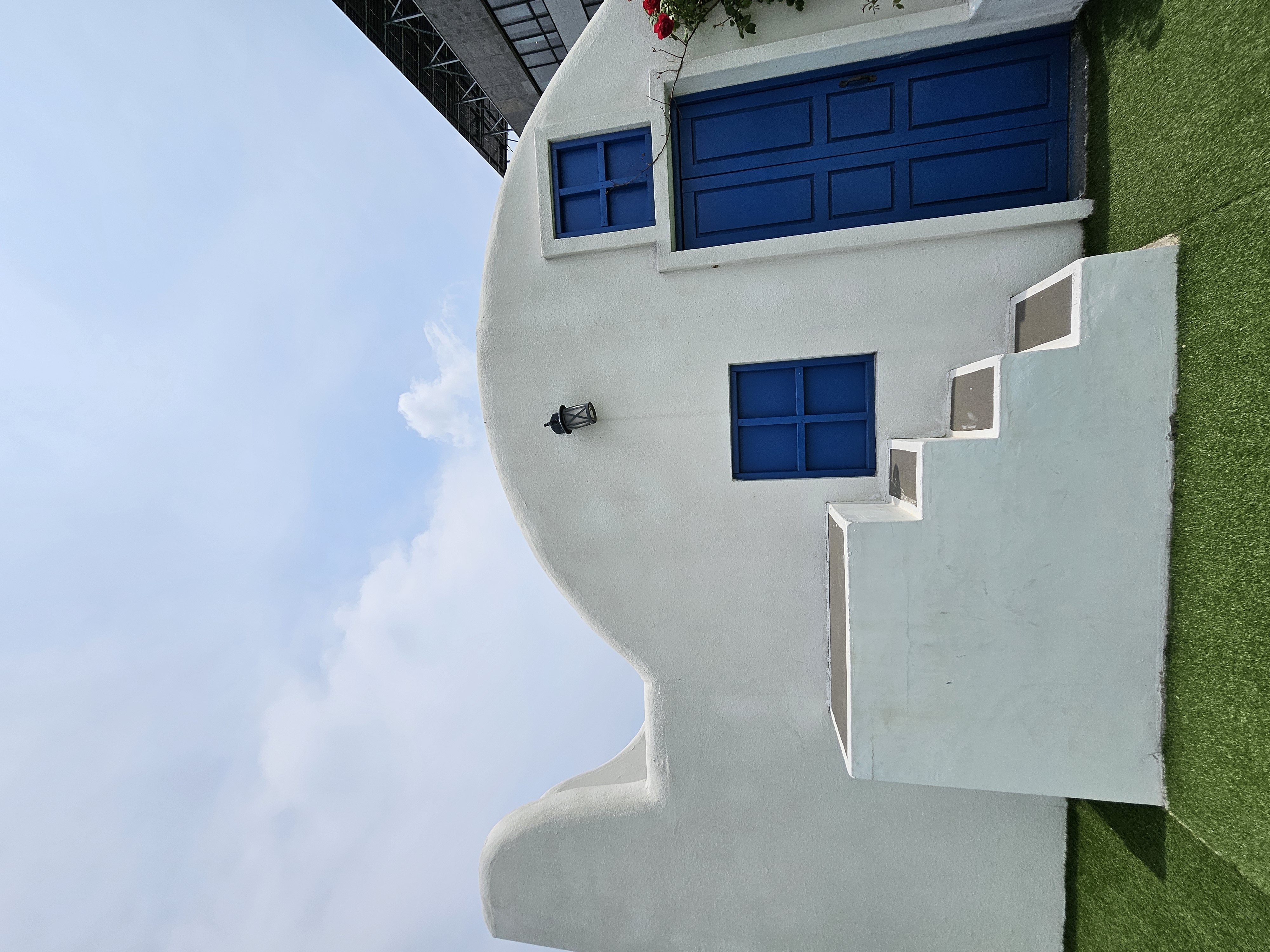 온통 하얀색 건물에 파란색 문으로