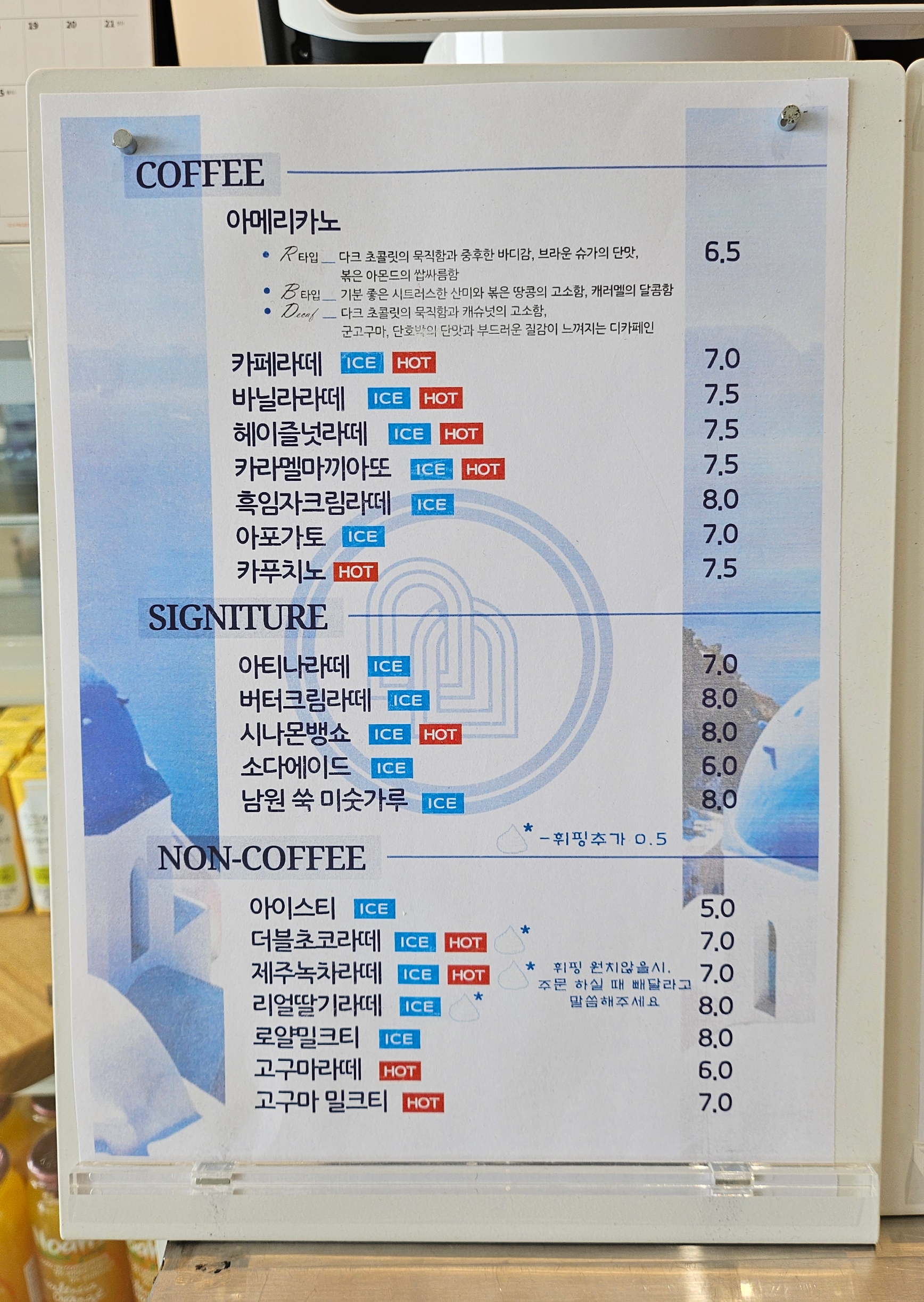 논커피, 티, 에이드, 스무디를 판매하고 있습니다.