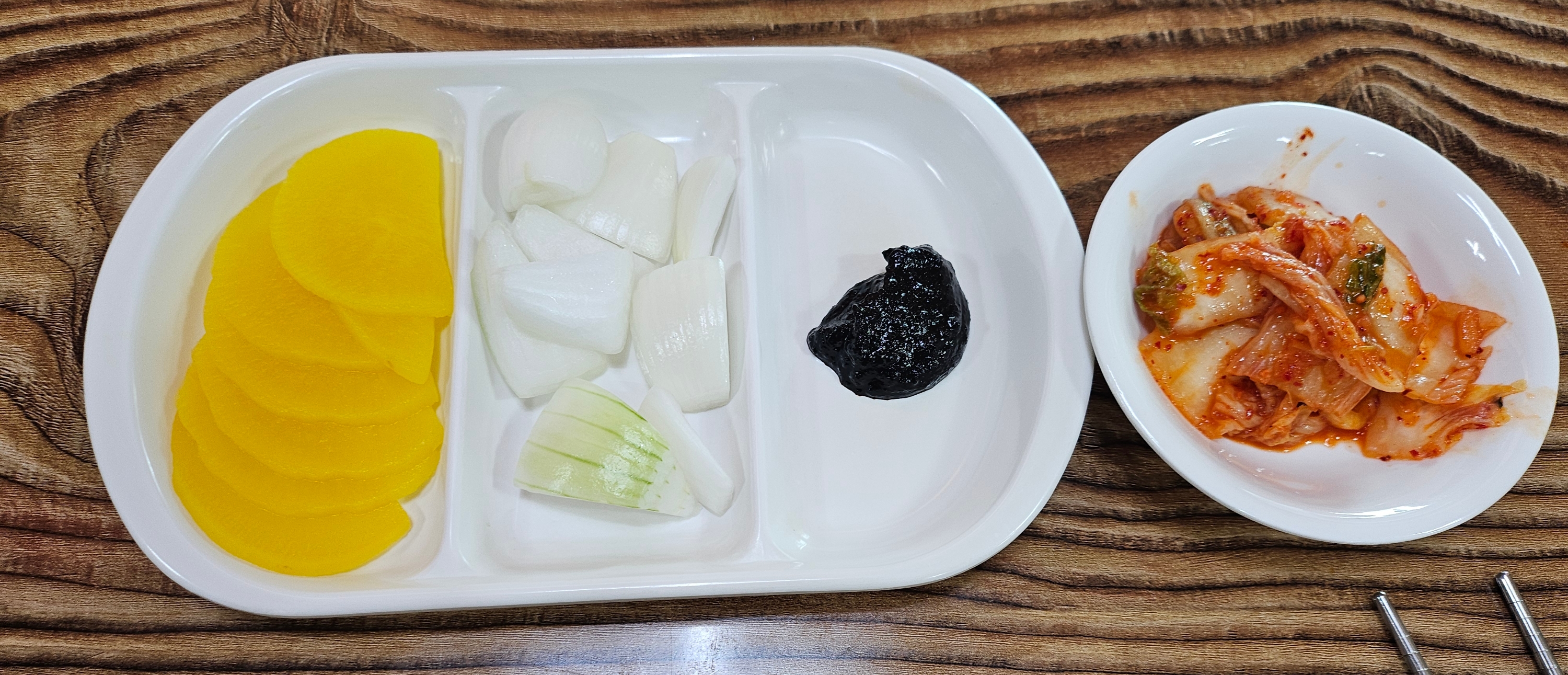 단무지, 양파, 김치가 정갈하게 놓여있습니다.