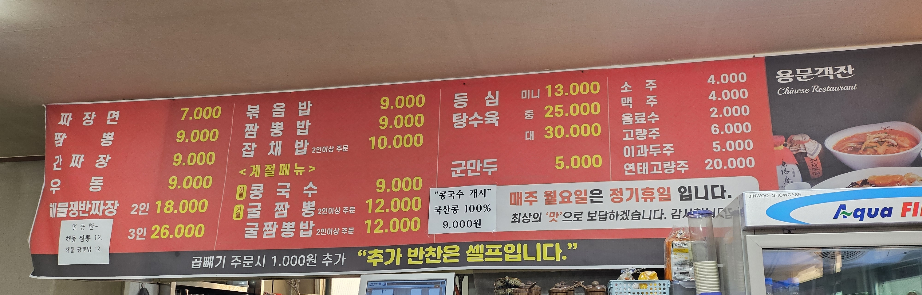 자장면 7,000원/ 짬뽕 9,000원/ 간짜장 9,000원/ 우동 9,000원/