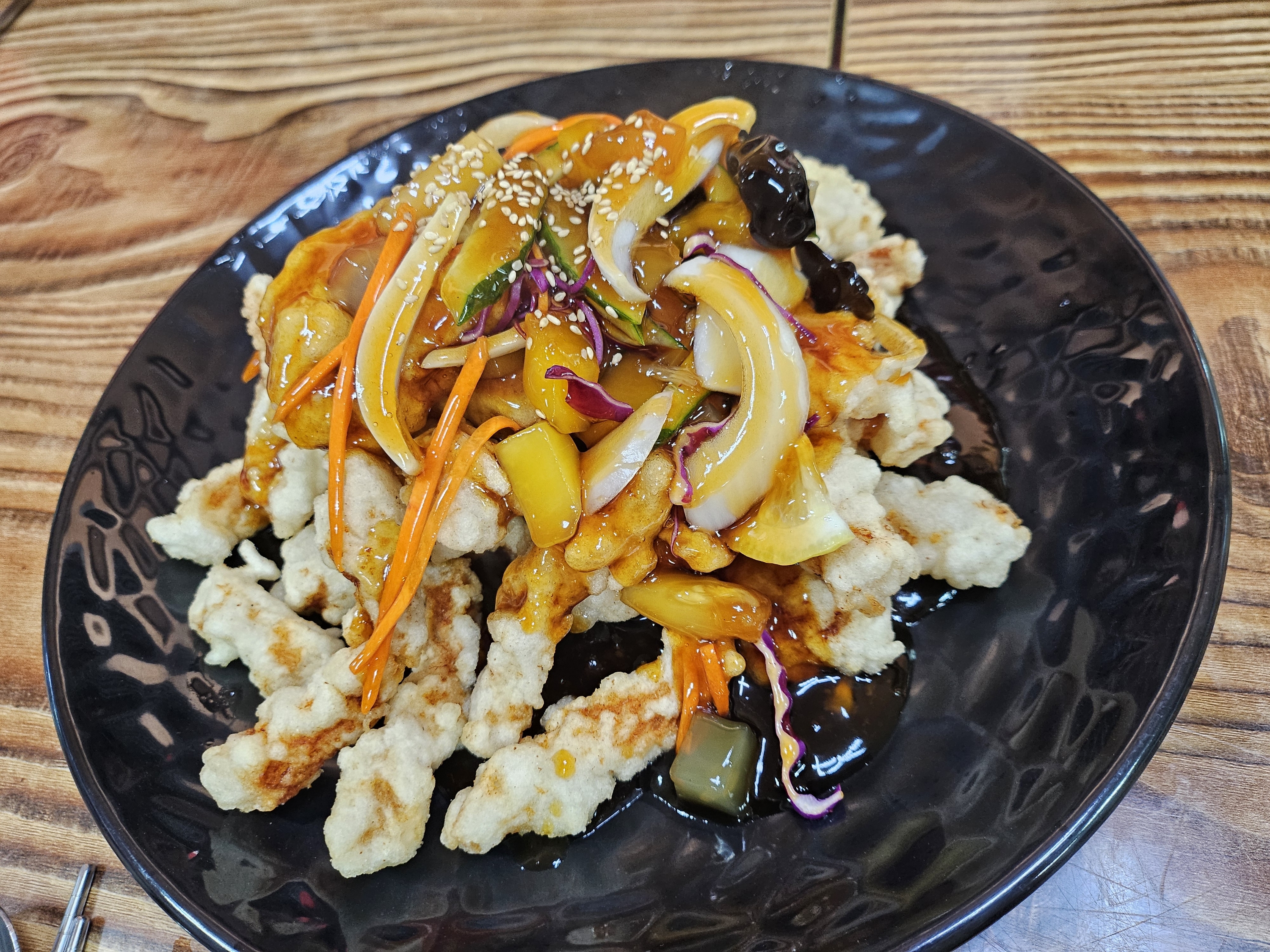 잘 튀겨진 탕수육에 윤기가 자르르한 소스가 위에 뿌려져 나옵니다.
