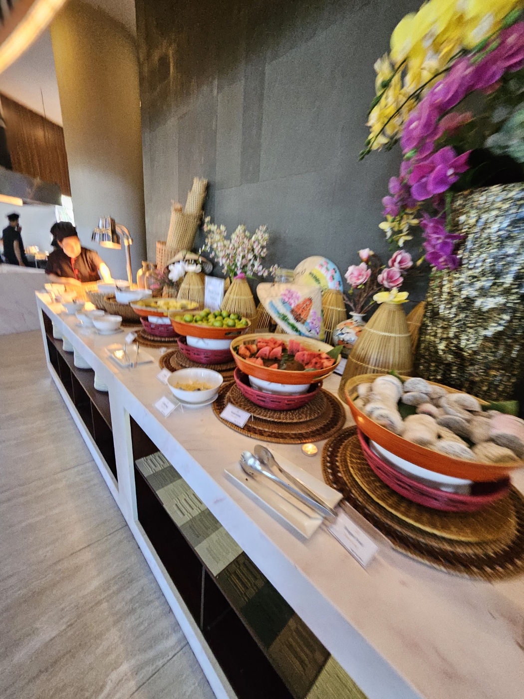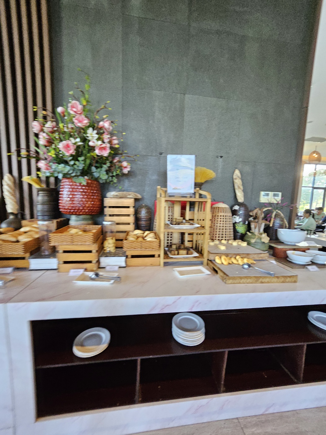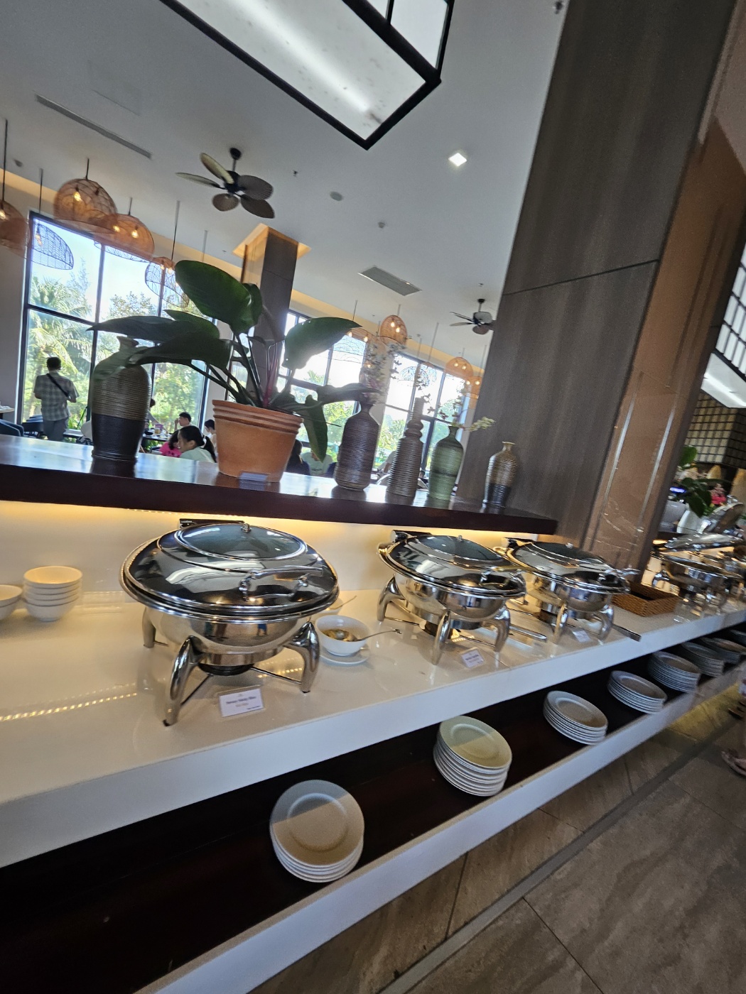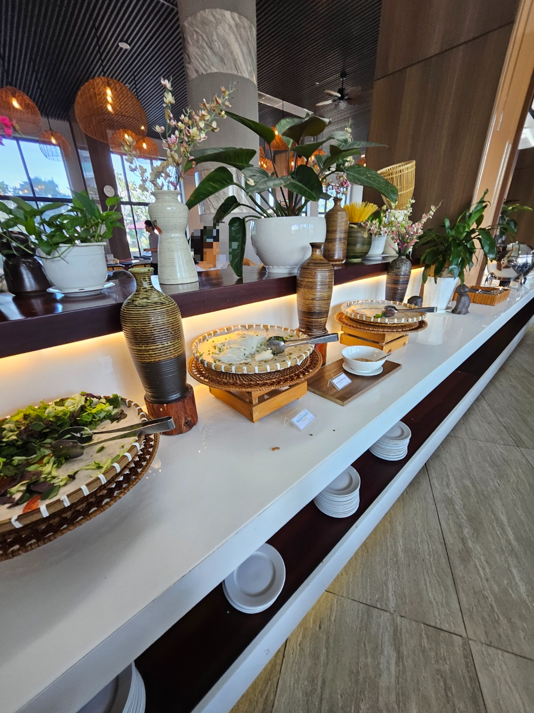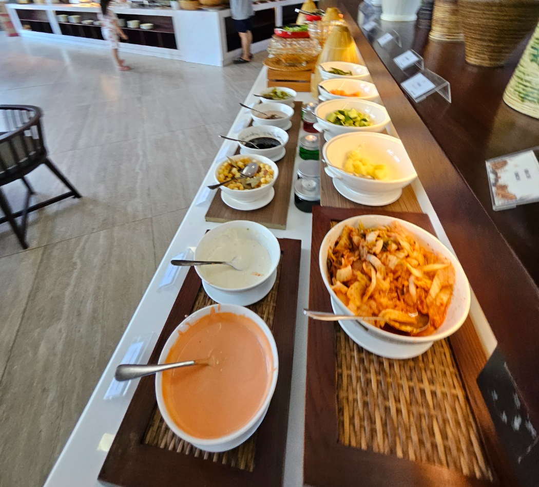 조식에서 생각나는 메뉴를 적어보자면 오믈렛, 쌀국수, 달걀프라이, 베이컨, 옥수수, 고구마, 시리얼, 요구르트, 팬케이크, 각종 빵, 디저트, 쌀밥, 계란밥, 죽, 샐러드, 치즈, 수박, 파인애플, 용과, 구아바, 망고주스, 수박주스, 오렌지주스, 물, 커피, 연유, 해쉬포테이토, 각종 햄, 각종 따뜻한 음식 등입니다.