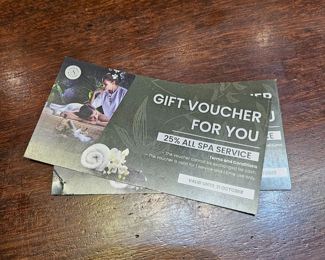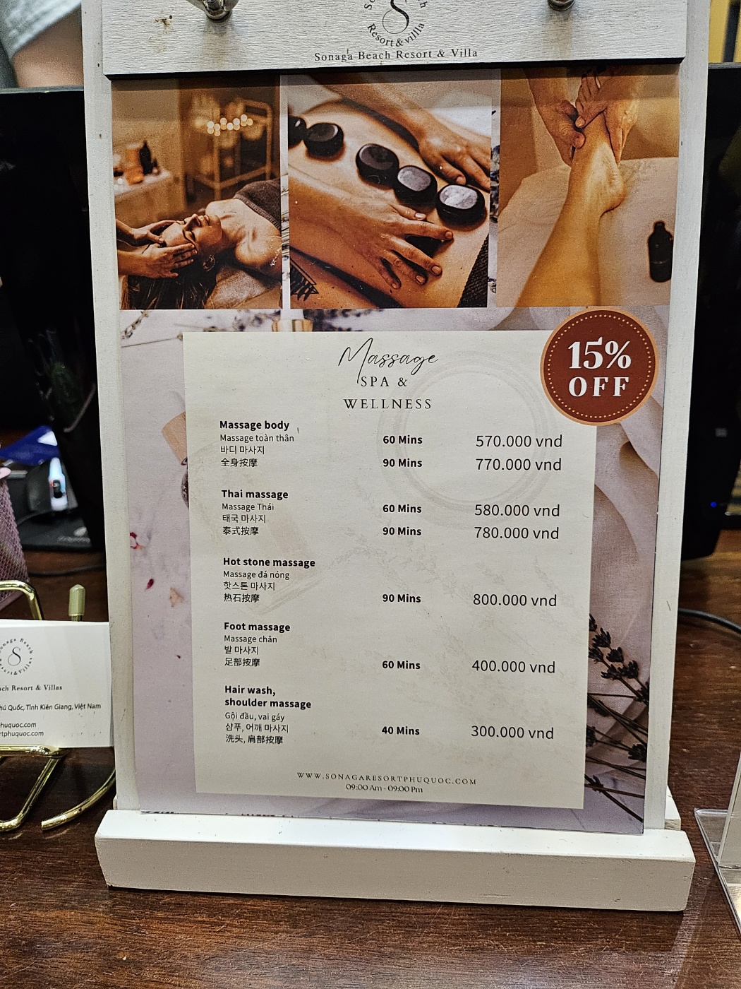 소나가 비치 리조트 앤 빌라 내에 있는 마사지샵 이용 시 25% 할인쿠폰 3장을 받았습니다.