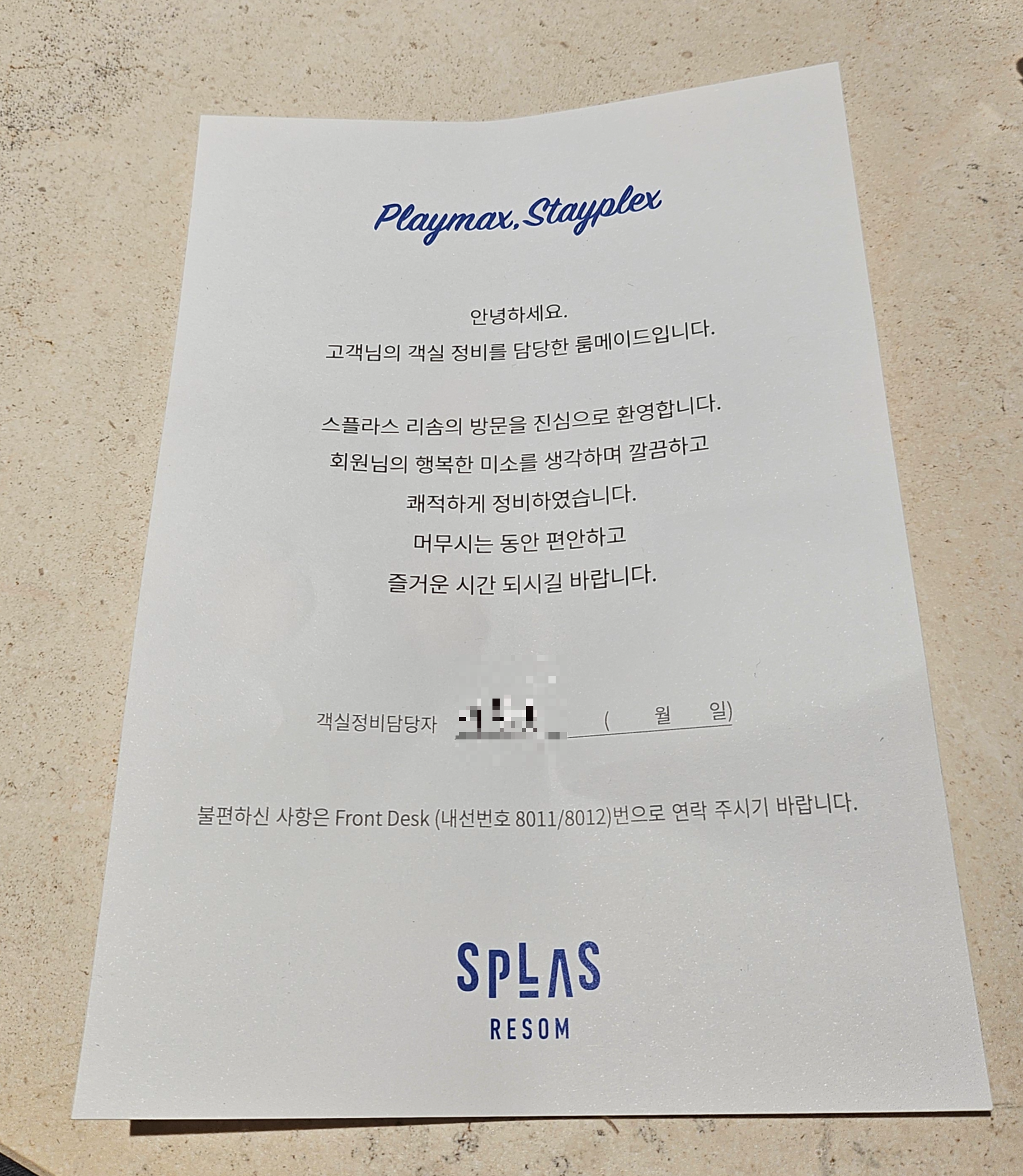 객실 정비를 담당한 룸메이드의 성함과 글귀가 적힌 종이를 보고