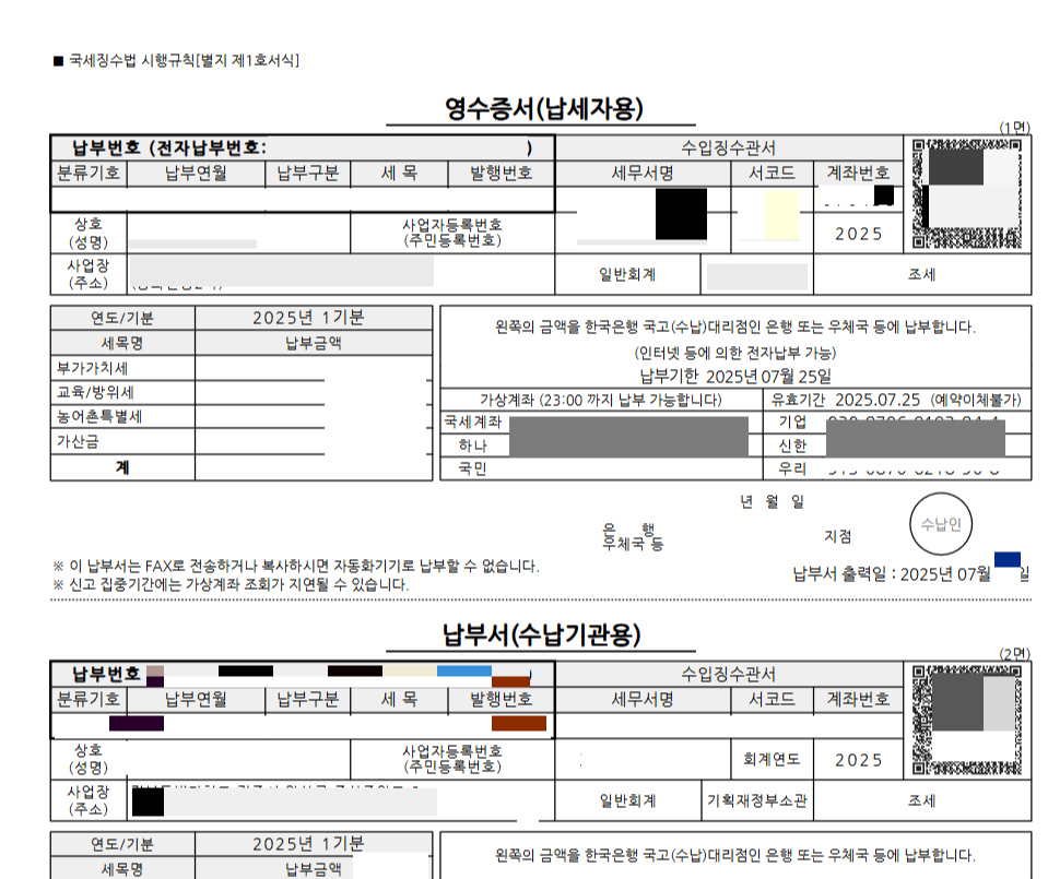 예정 신고나 예정고지로 이미 납부한 금액은 여기서 차감 후 남은 금액만 추가로 납부하게 됩니다.