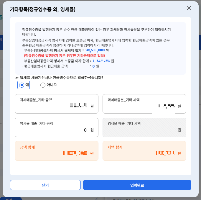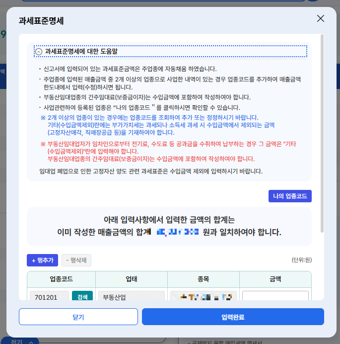 과세표준명세는 이미 작성한 매출금액의 합계와 일치하게 입력하시고