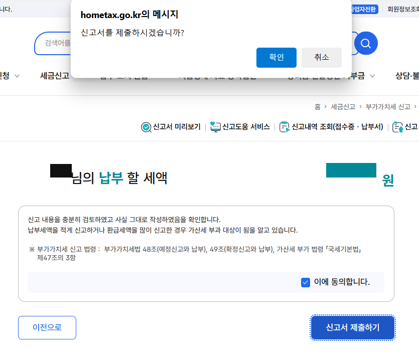 '신고서를 제출하시겠습니까?'에 '확인'을 클릭하시면
