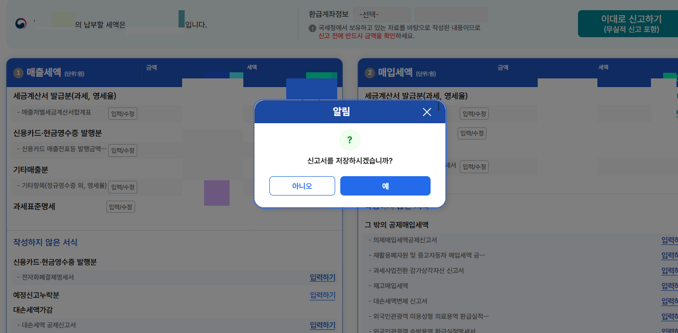 그럼 신고서를 저장하시겠습니까?라는 창에