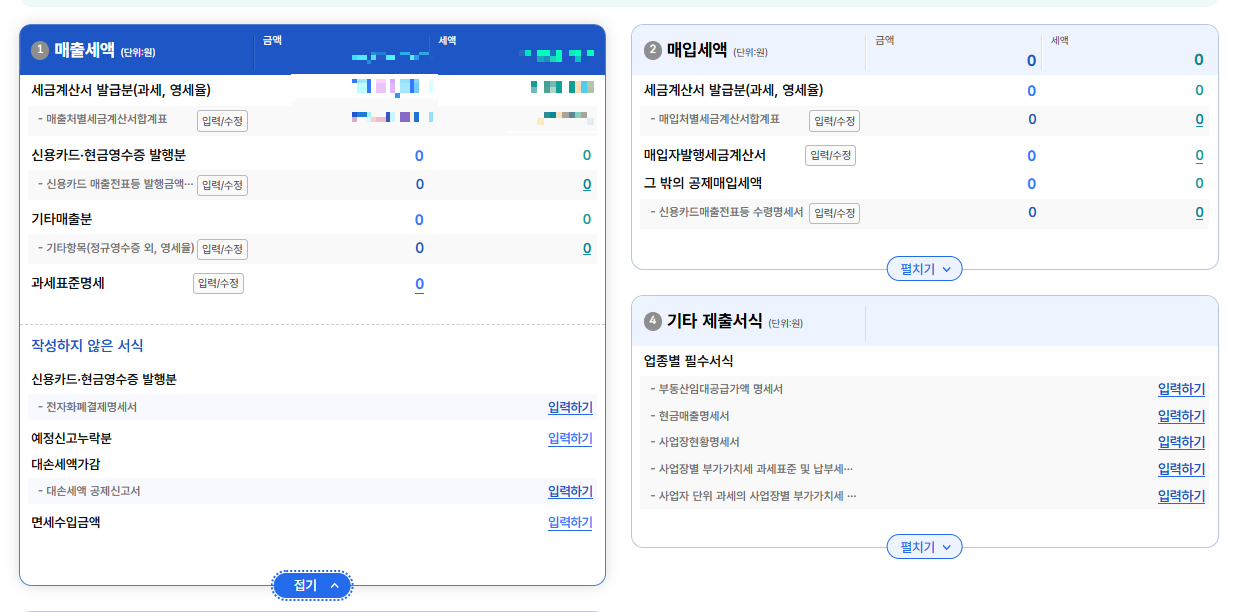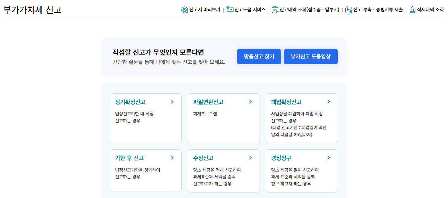 부가가치세 신고의 여러 메뉴들 중