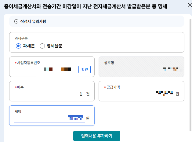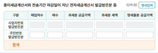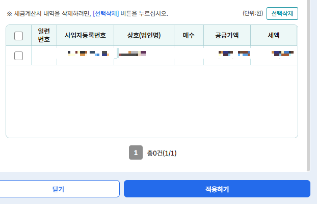 사업자 등록번호와 매수, 공급가액, 세액을 적어 적용합니다.