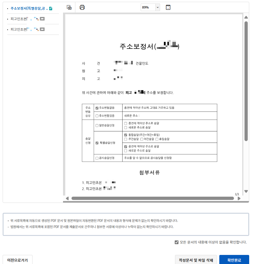 그럼 작성한 주소보정서와 첨부한 피고인의 초본을 미리 보기로 다시 확인하시고