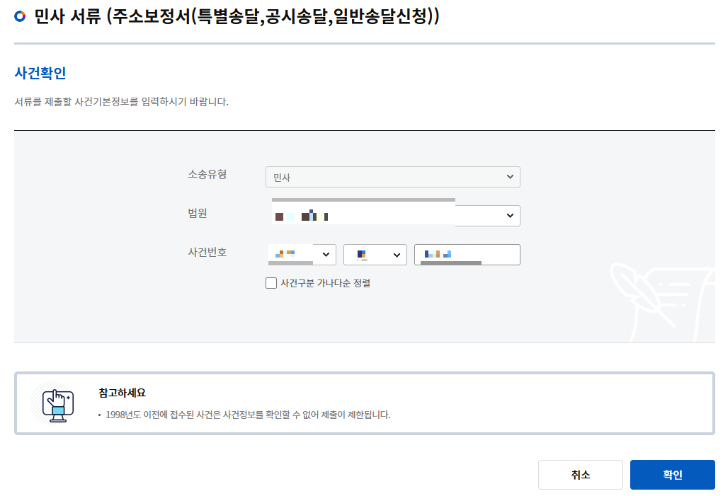 그럼 법원과 사건번호가 자동으로 뜨게 되고 '확인'을 클릭합니다.