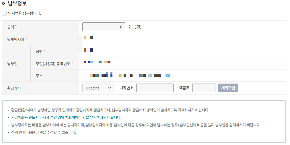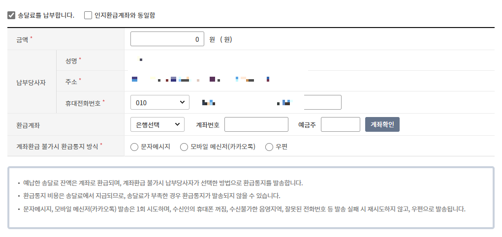 그리고 기존 송달주소와 동일한 주소로 다시 송달에 체크했습니다.
