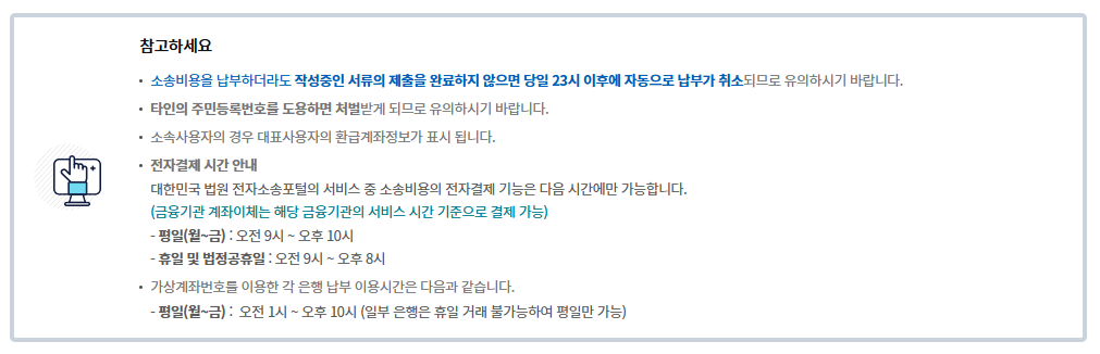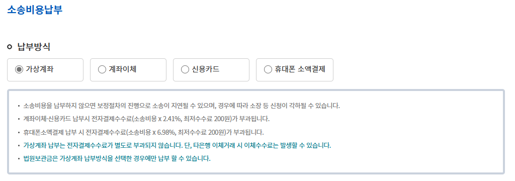 계좌이체·신용카드 납부 시 전자결제 수수료는 소송비용 ×2.41%, 최저 수수료 200원,