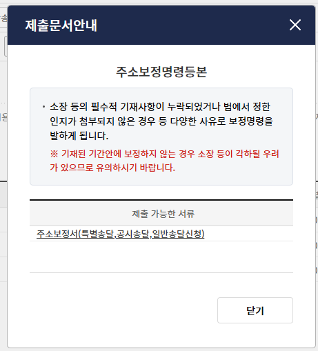 주소보정서(특별송달, 공시송달, 일반송달신청)가 뜨게 됩니다.
