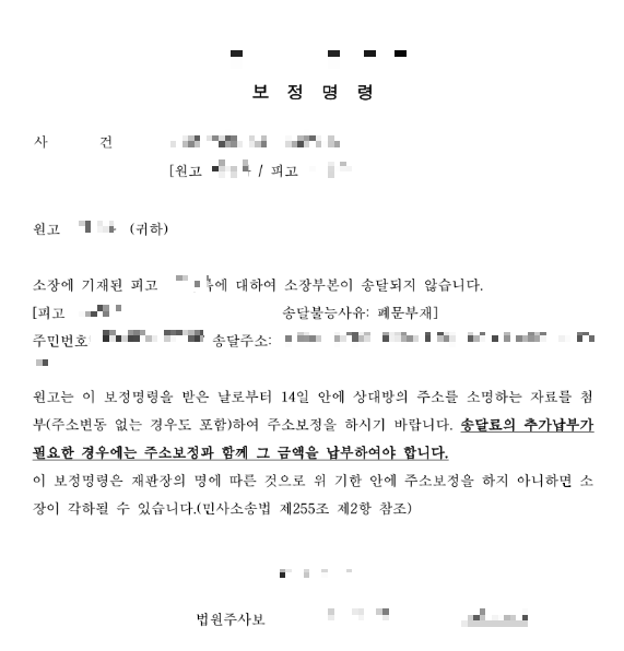 주소보정명령은 법원이 원고에게 내리는 일종의 보정명령입니다.