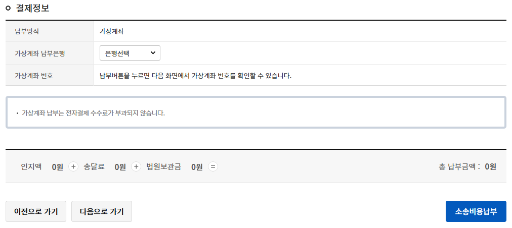 가상계좌를 받을 은행을 선택하고 소송비용납부를 클릭합니다.