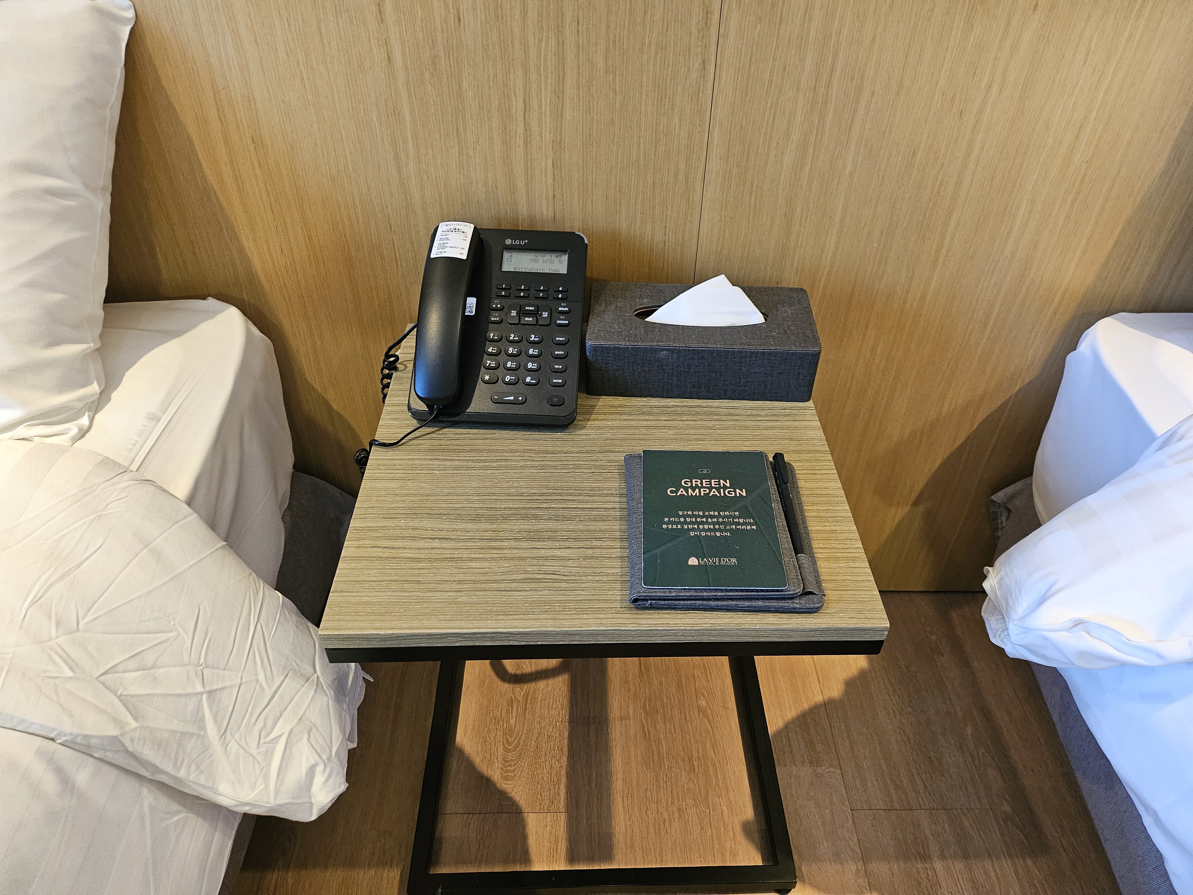 중앙에는 전화기와 티슈, 충전할 수 있는 콘센트도 있어