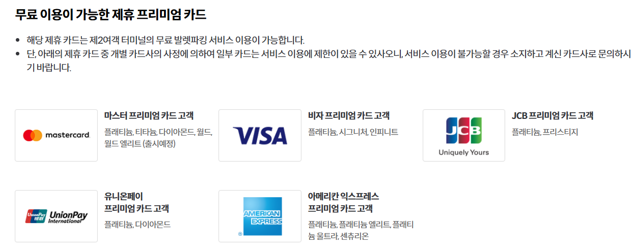 위 카드들은 제2여객터미널에서 무료로 발레파킹 서비스이용이 가능합니다.