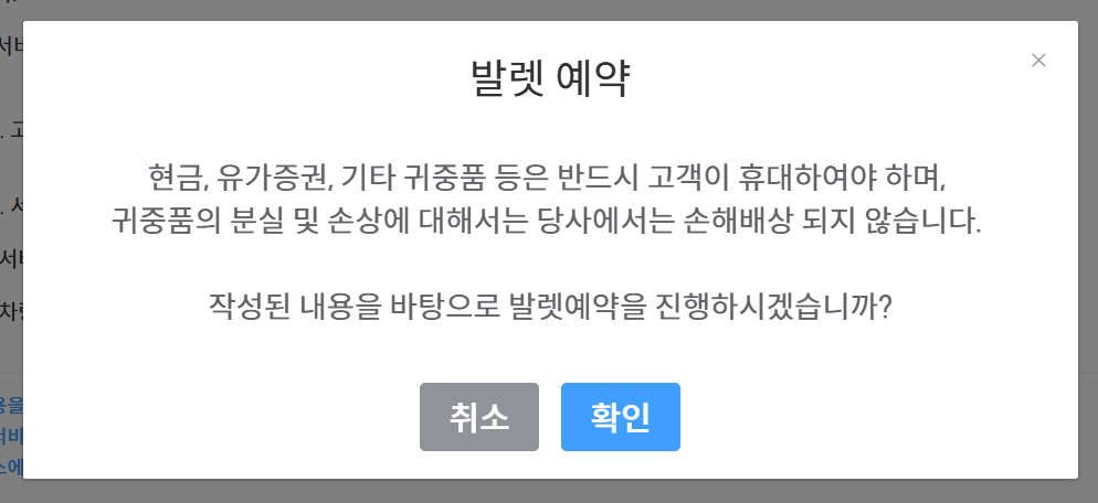 작성된 내용을 바탕으로 발레예약을 진행하시겠습니까?'라는 창에