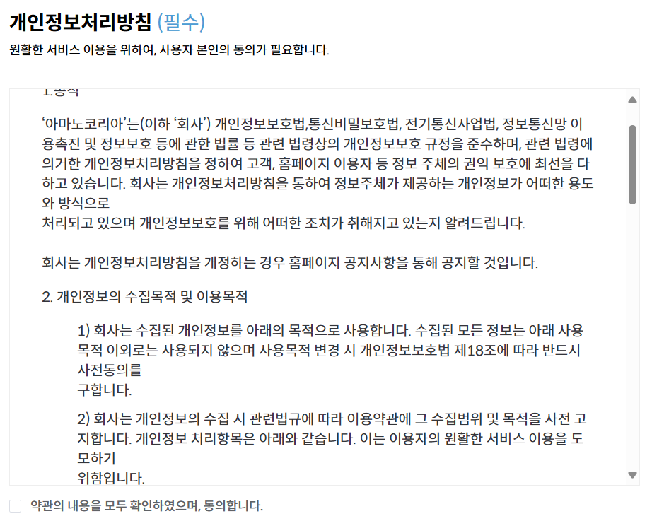 개인정보처리방침과 이용약관에 동의 체크하시고