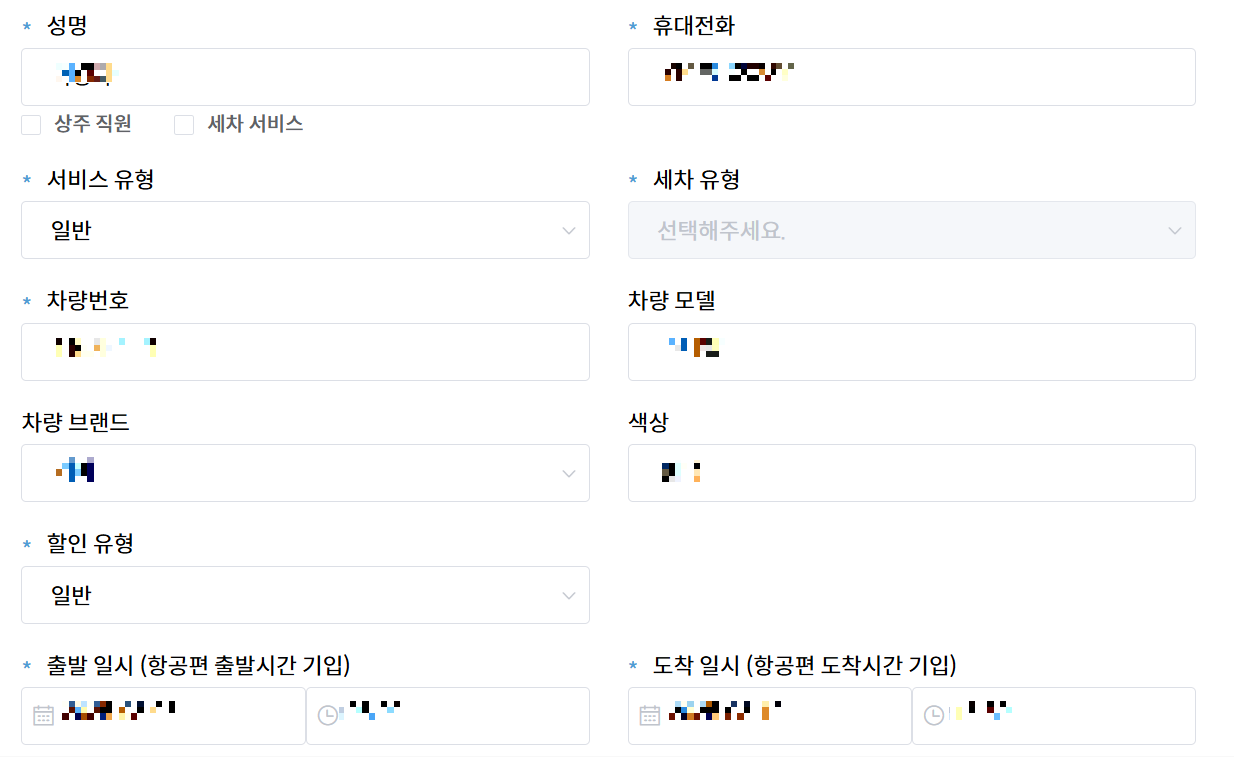 성명과 휴대전화, 서비스유형, 차량번호, 차량모델, 차량브랜드, 색상, 할인유형, 출발일시, 도착일시를