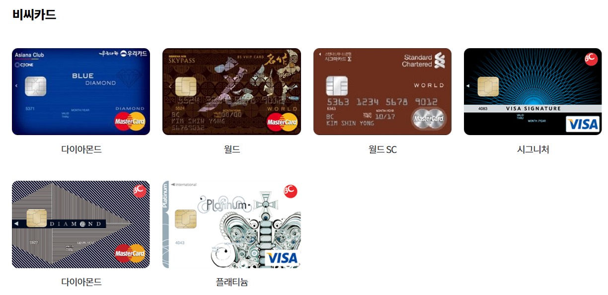 비씨카드는 다이아몬드카드, 월드카드, 월드 SC카드, 시그니처카드, 플래티늄 카드가 해당됩니다.