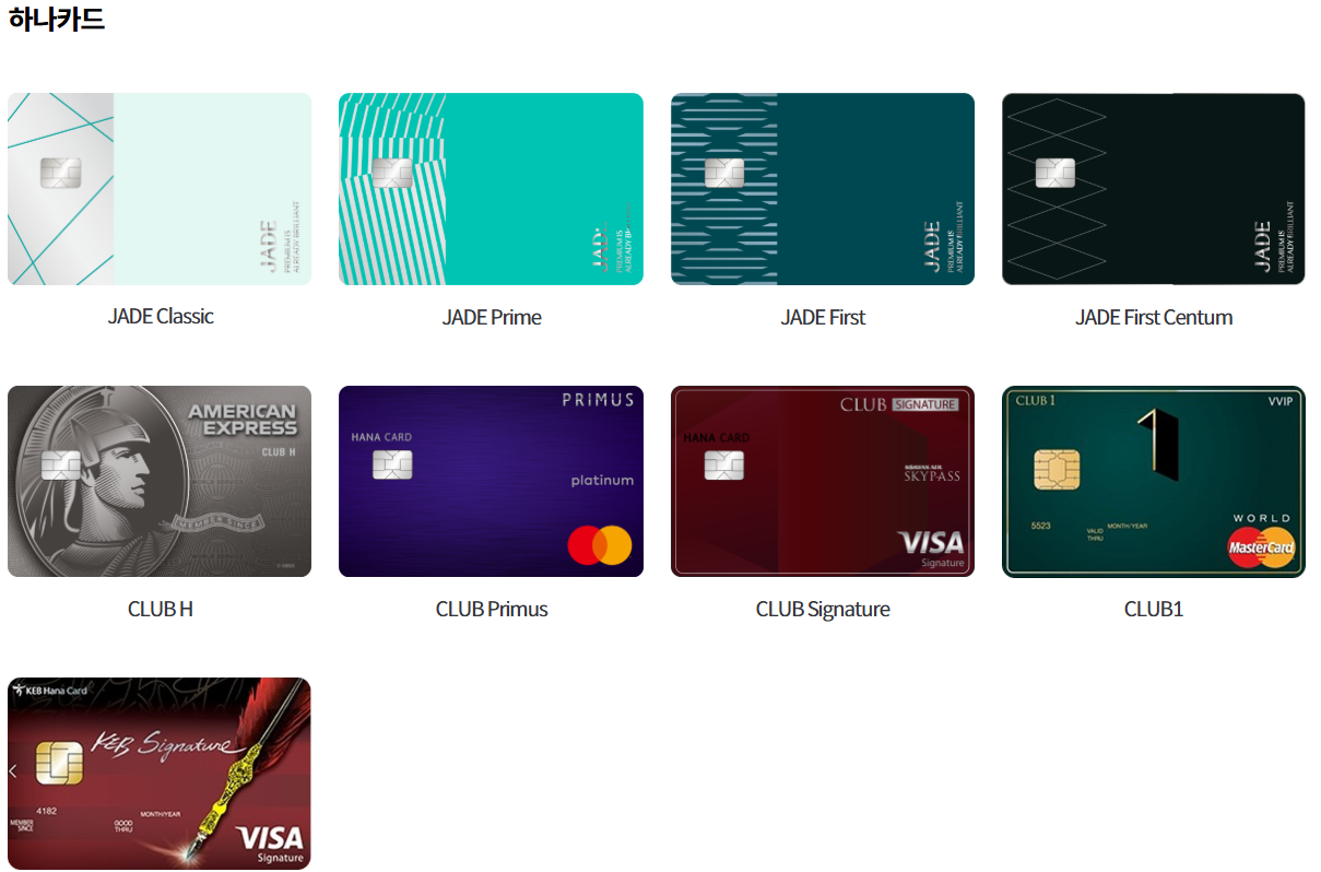 하나카드는 JADE Classic카드, JADE Prime카드, JADE First카드, JADE First Centum카드,