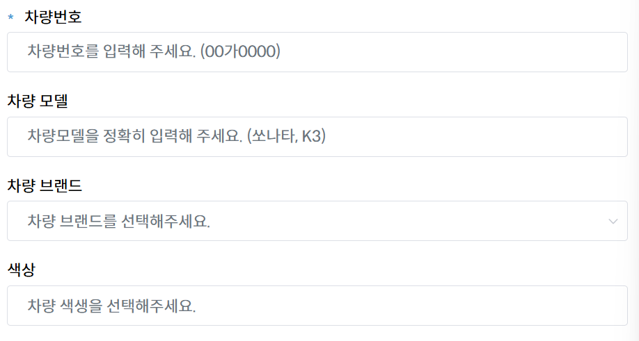 다음으로 차량번호와 차량모델, 차량브랜드, 색상을 선택하여 입력합니다.
