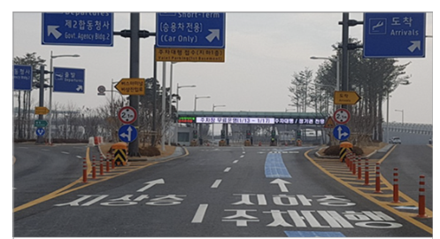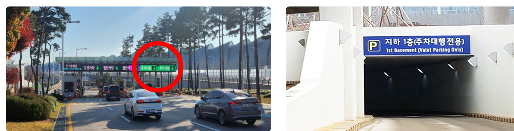 터미널 진입 시 파란색 바닥라인을 따라가 주차대행 전용차선으로 진입합니다.