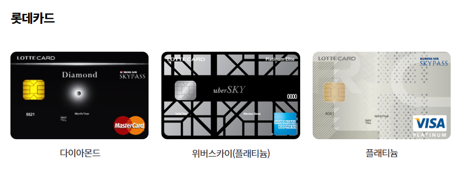 롯데카드는 다이아몬드카드, 위버스카이 플래티늄카드, 플래티늄 카드입니다.