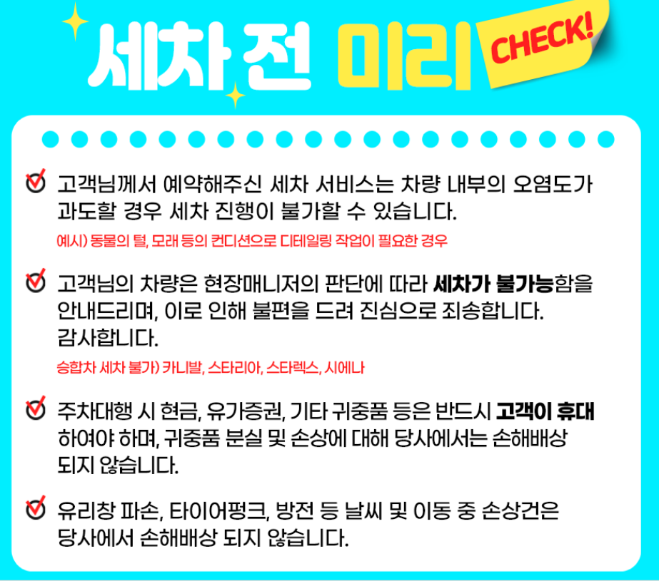차량 내부 오염이 강할 경우, 타니발, 스타리아, 스타렉스, 시에나 등 세차가 불가능한 차량인 경우 등은