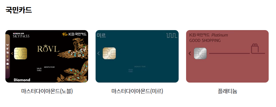 국민카드는 마스터다이아몬드 노블카드, 마스터다이아몬드 미르카드, 플래티늄 카드입니다.