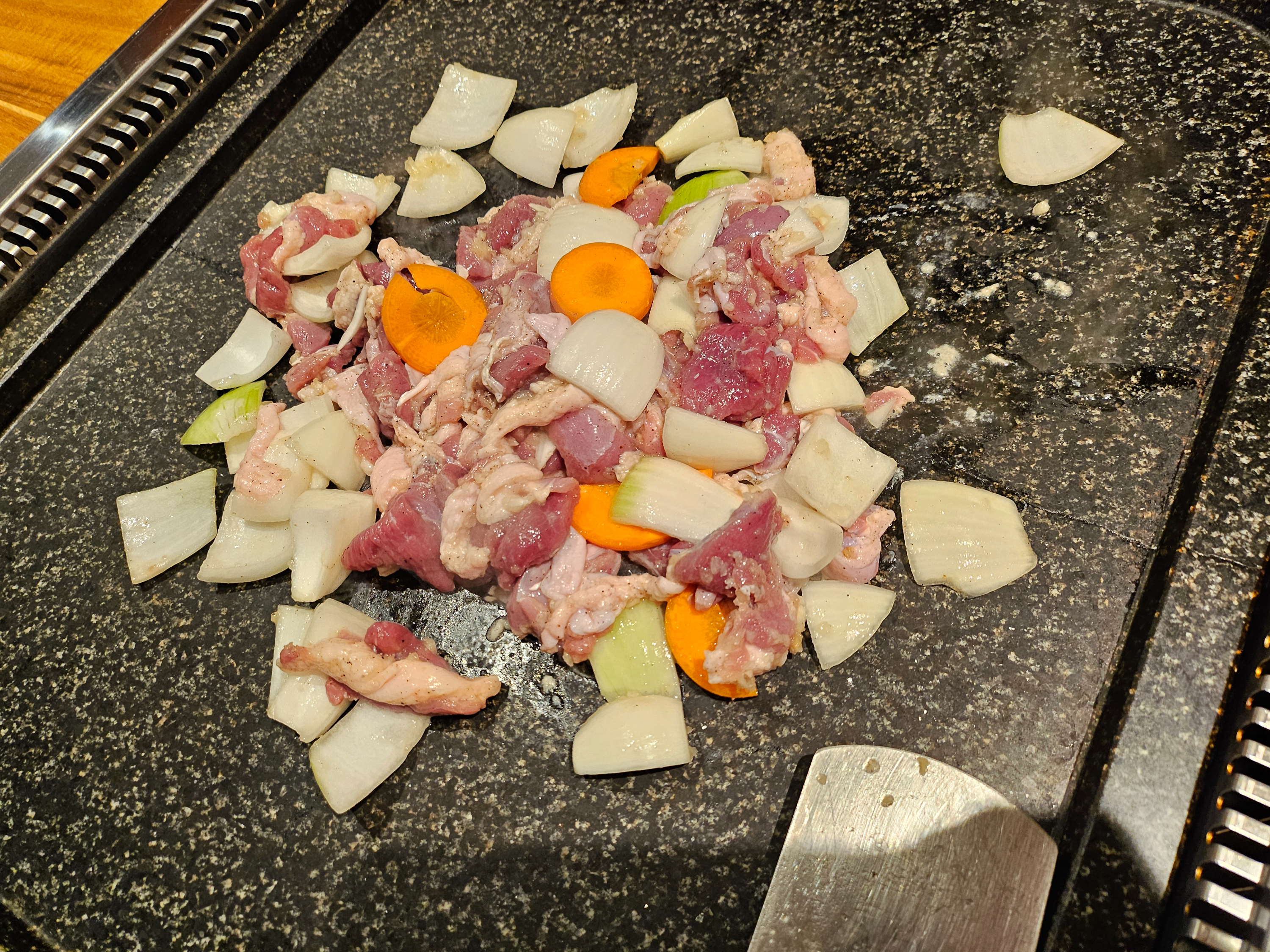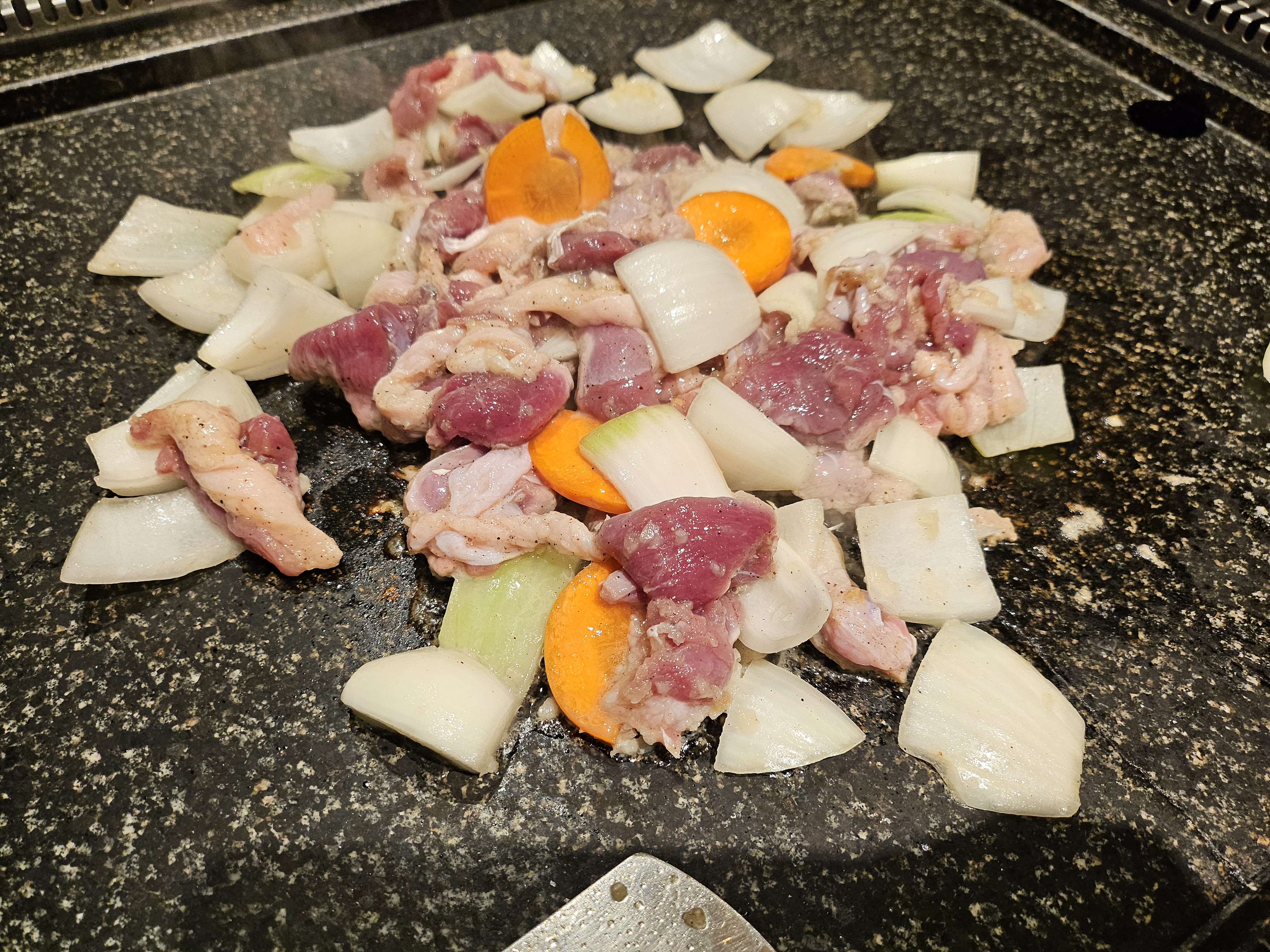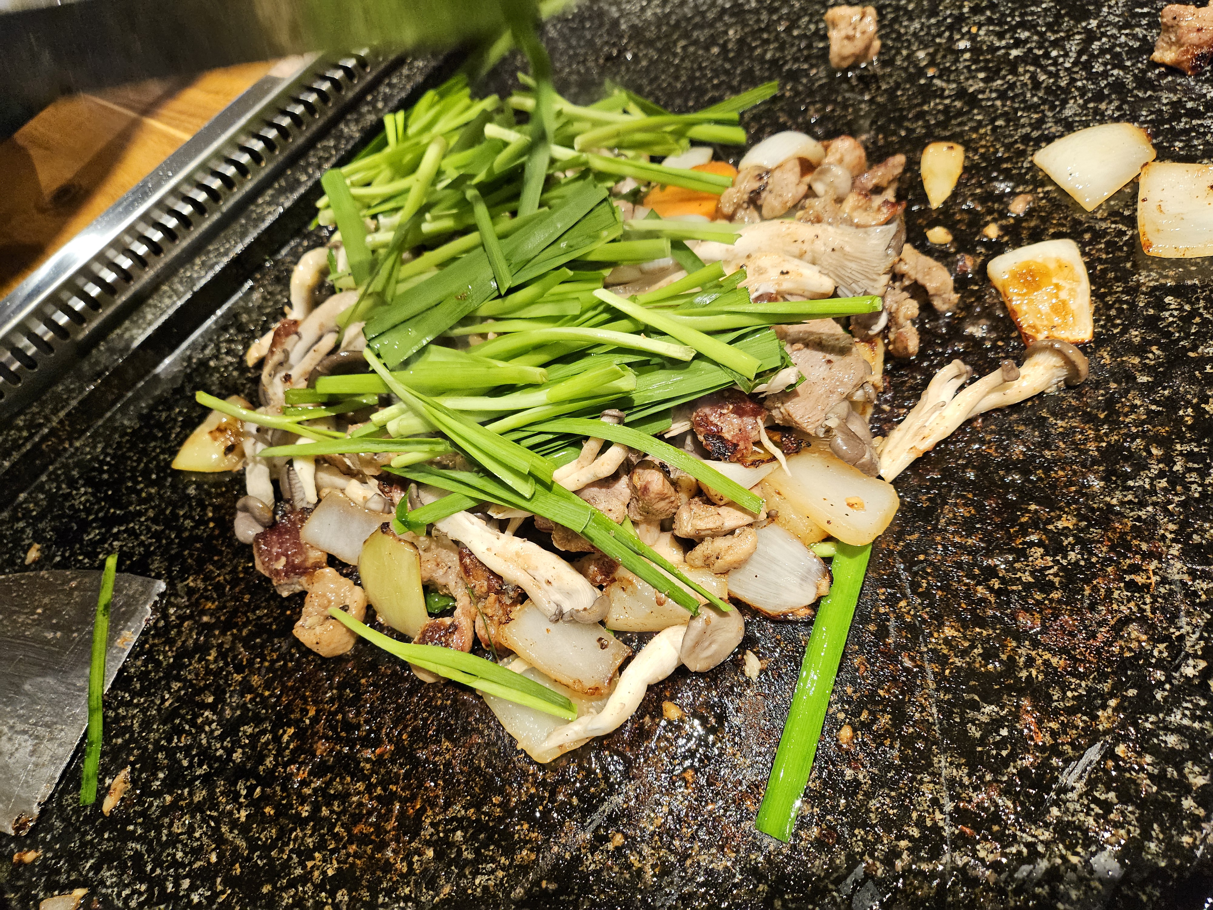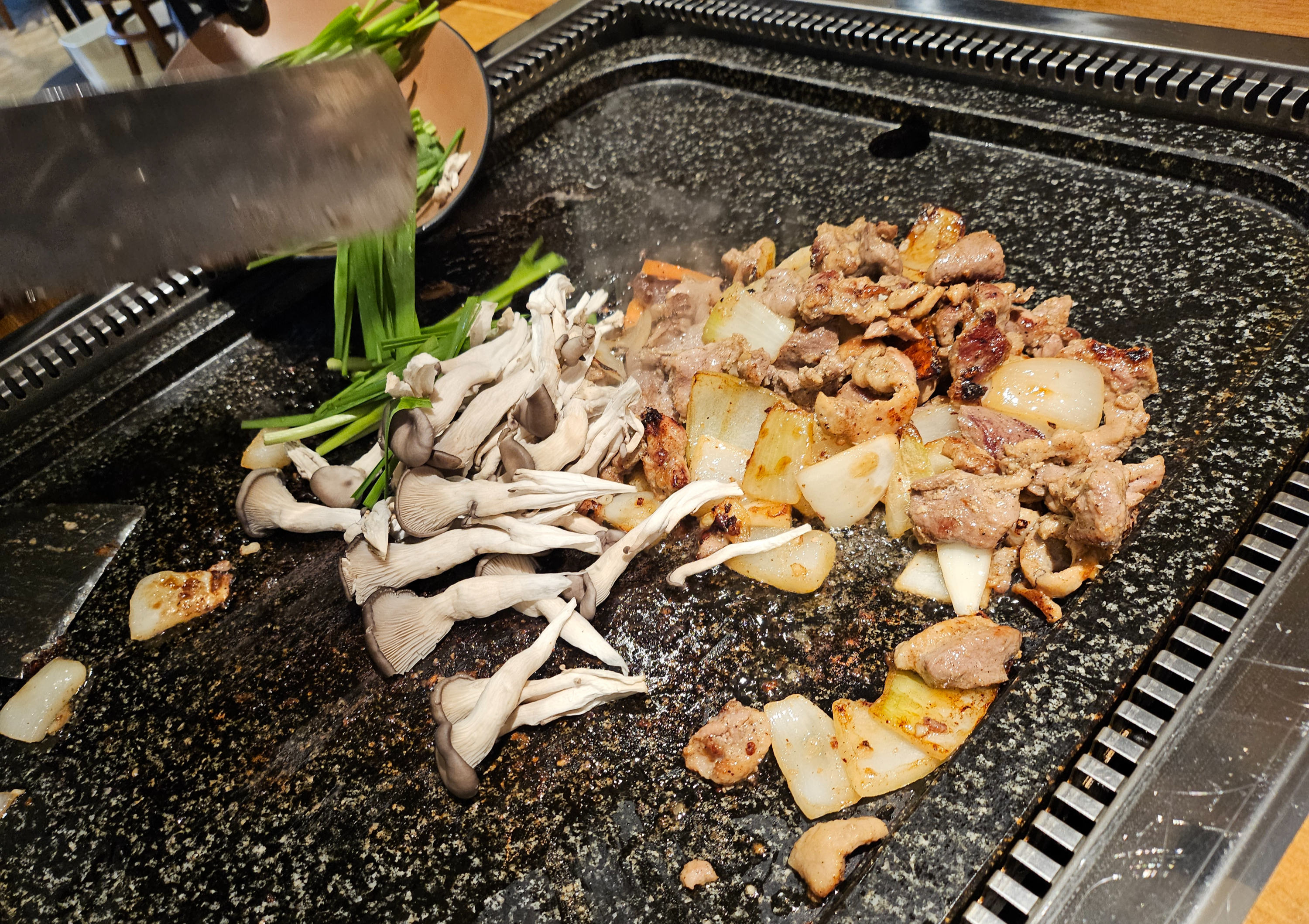 아주 넓은 불판에 지글지글 잘 익어갑니다.