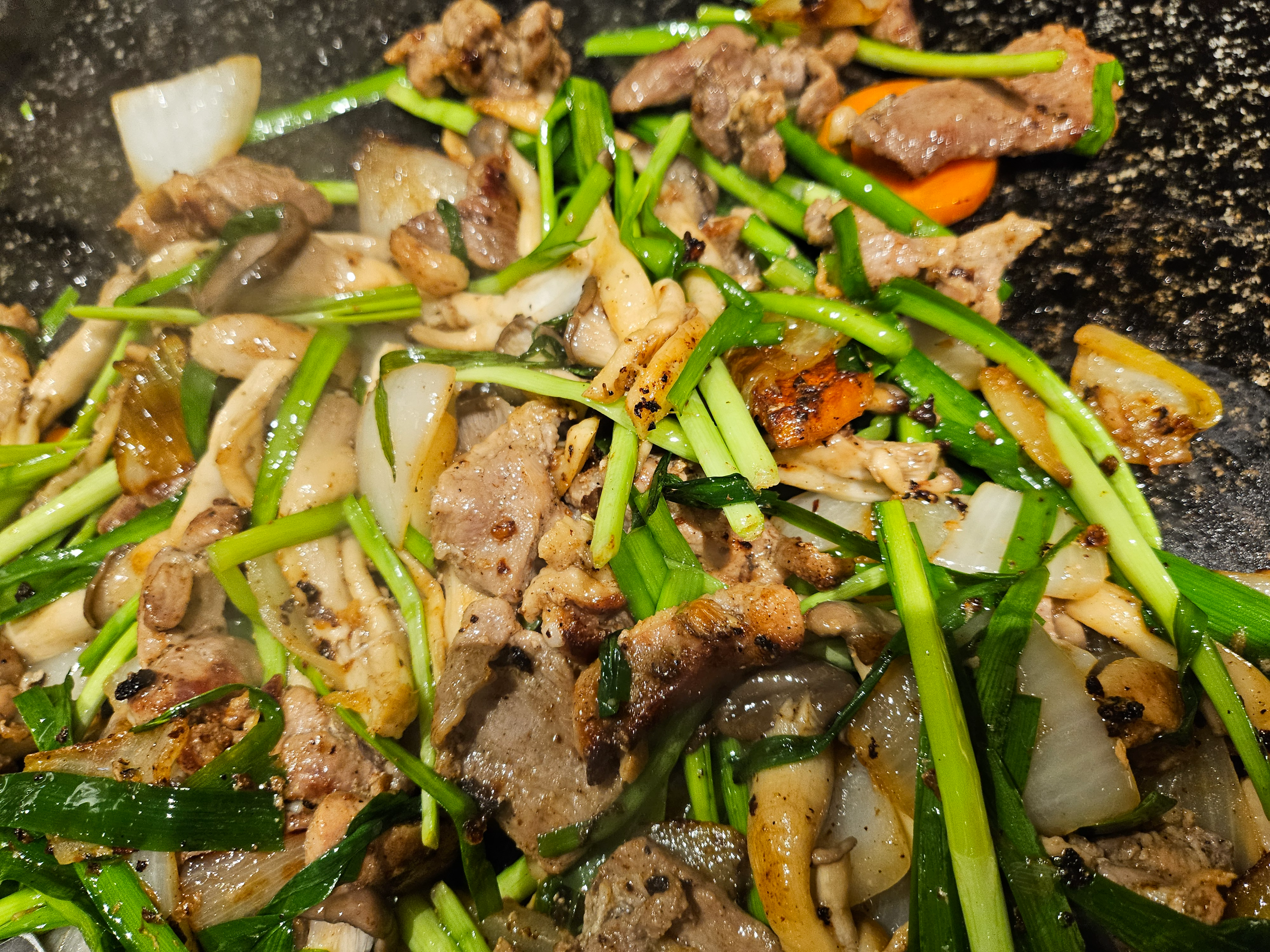 고기 위에 부추와 버섯을 얹은 후 숨이 좀 죽으면