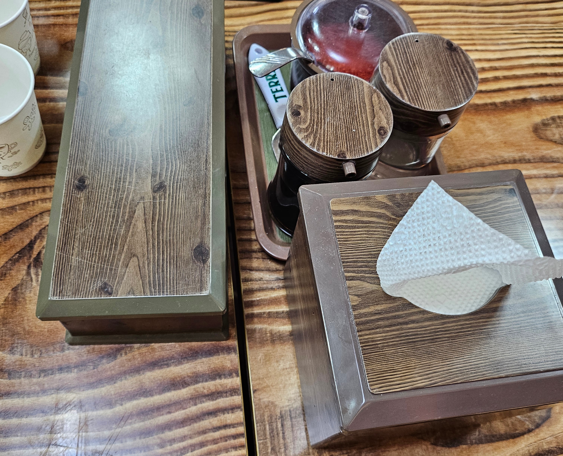 티슈, 간장, 식초, 고춧가루가 세팅되어 있습니다.