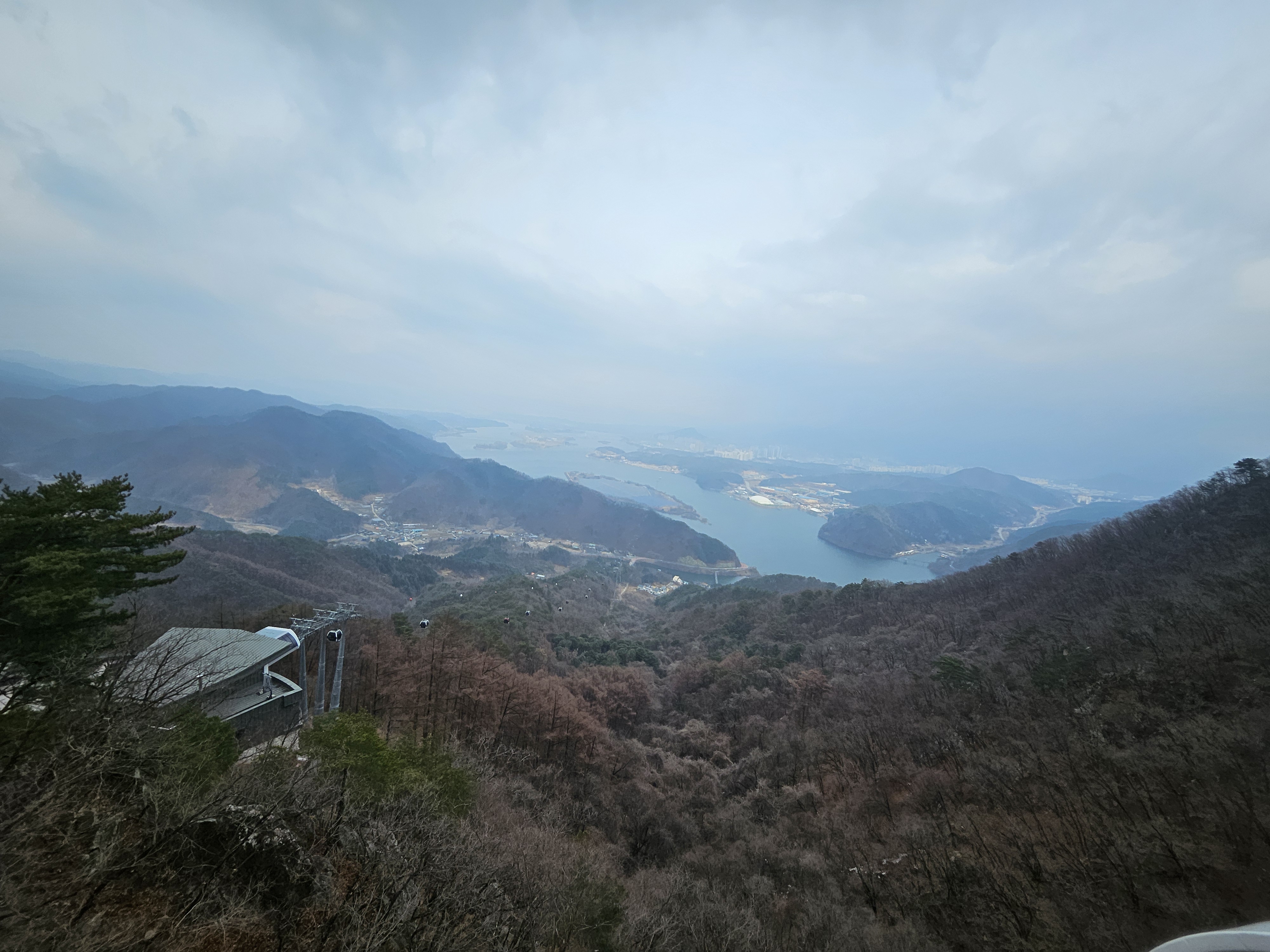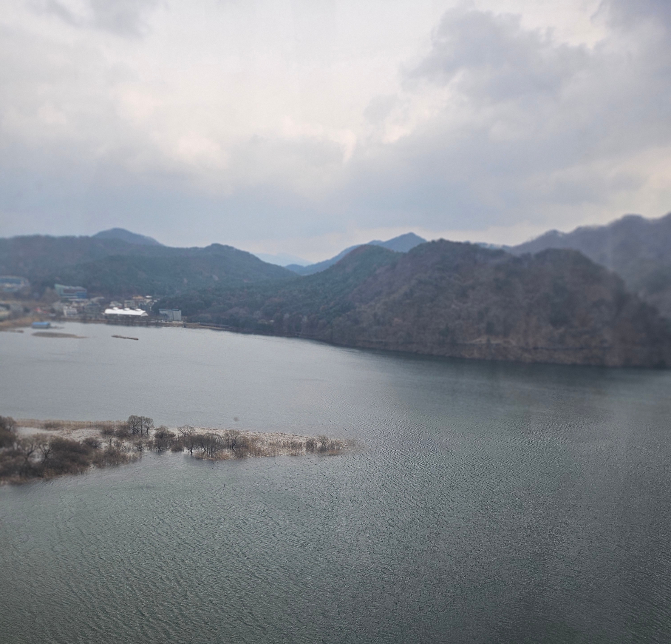 캐빈 안에서 내려다보는 호수와 산, 나무, 춘천 시내가 한눈에 보여