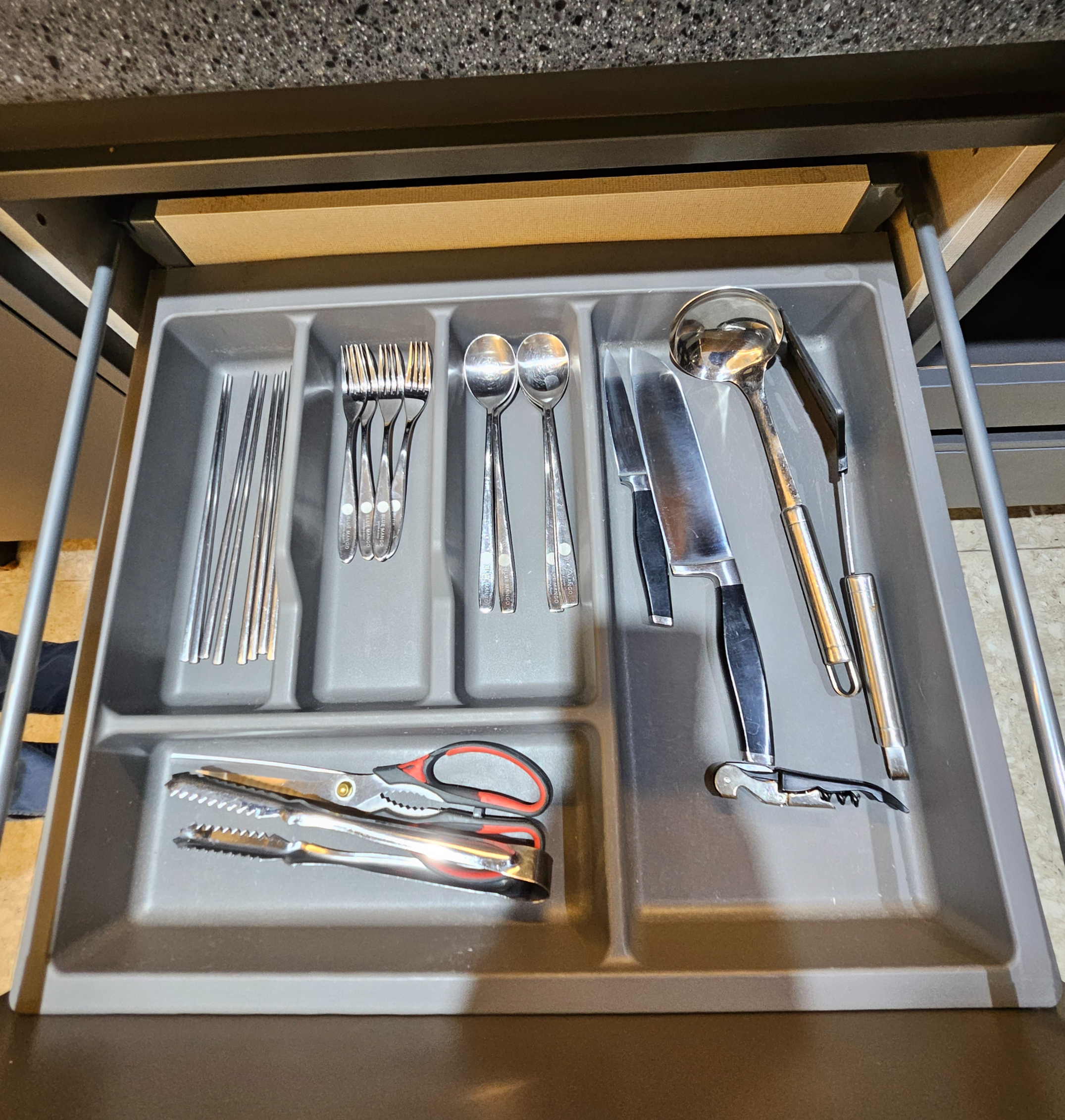 주방 하부장에는 냄비와 프라이팬, 전기밥솥, 4인기준에 맞는 식기, 칼, 주걱, 뒤집개 등과