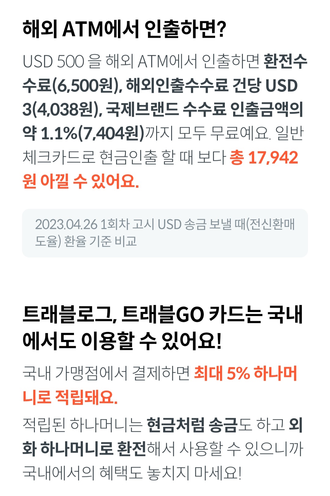 ATM기를 사용해도 현금인출에는 수수료가 발생하는데 트래블로그 카드는 ATM 인출에 대한 수수료가 면제입니다.